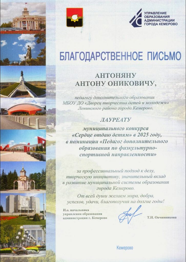 Антонян Антон Оникович — педагог дополнительного образования, руководитель творческого объединения «Новая волна» МБОУ ДО «Дворец творчества детей и молодежи» Ленинского района г. Кемерово стал Лауреатом муниципального этапа Всероссийского конкурса «Сердце отдаю детям»-2025!