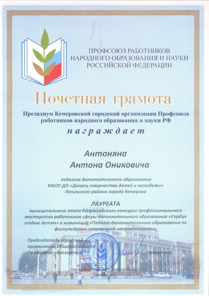 19 сентября 2025 года состоялось награждение по результатам очного тура конкурсных испытаний. В торжественной обстановке Антон Оникович был награжден благодарственным письмом Управления образования администрации г. Кемерово, почетной грамотой Президиума Кемеровской городской организации Профсоюза работников народного образования и науки РФ и денежной премией.