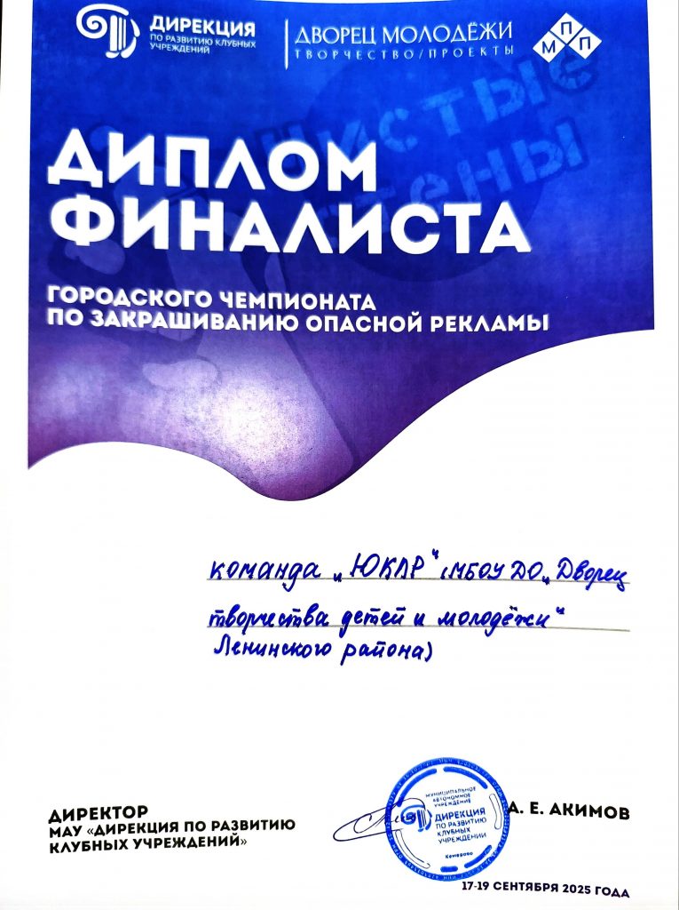 Поздравляем финалистов городского чемпионата «Чистые стены»- Ассоциации «Юные кемеровчане Ленинского района» МБОУ ДО «Дворец творчества детей и молодежи» Ленинского района г. Кемерово, которая заняла почетное 3 место.