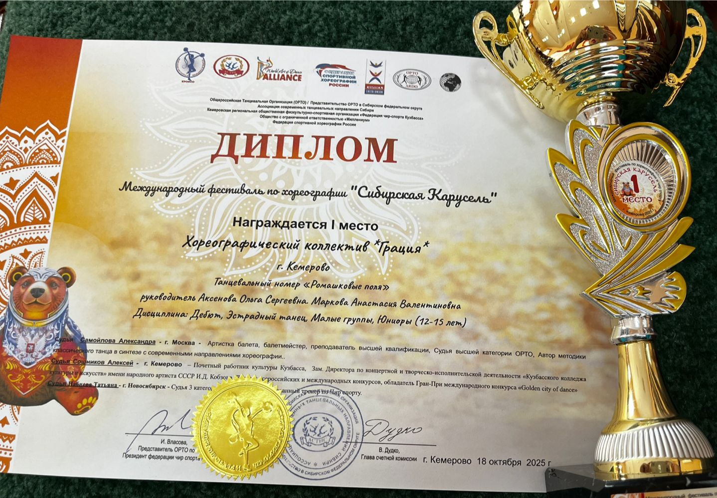 18 октября 2025 г. хореографический коллектив «Грация» «Дворца творчества детей и молодёжи» Ленинского района под руководством Аксёновой О.С. и Марковой А.В. принял участие в международном фестивале по хореографии «Сибирская карусель». На конкурс был представлен танец «Ромашковые поля», который жюри высоко оценило, присудив первое место. Пусть этот успех станет вдохновением для новых достижений и творческих высот!