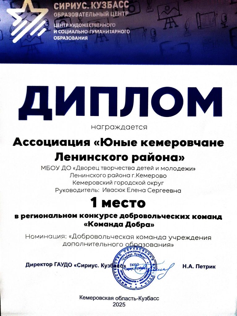 Поздравляем команду активистов ассоциации «Юные кемеровчане Ленинского района» Дворца творчества детей и молодежи Ленинского района г. Кемерово с победой (1 место) в областном конкурсе «Команда добра»!