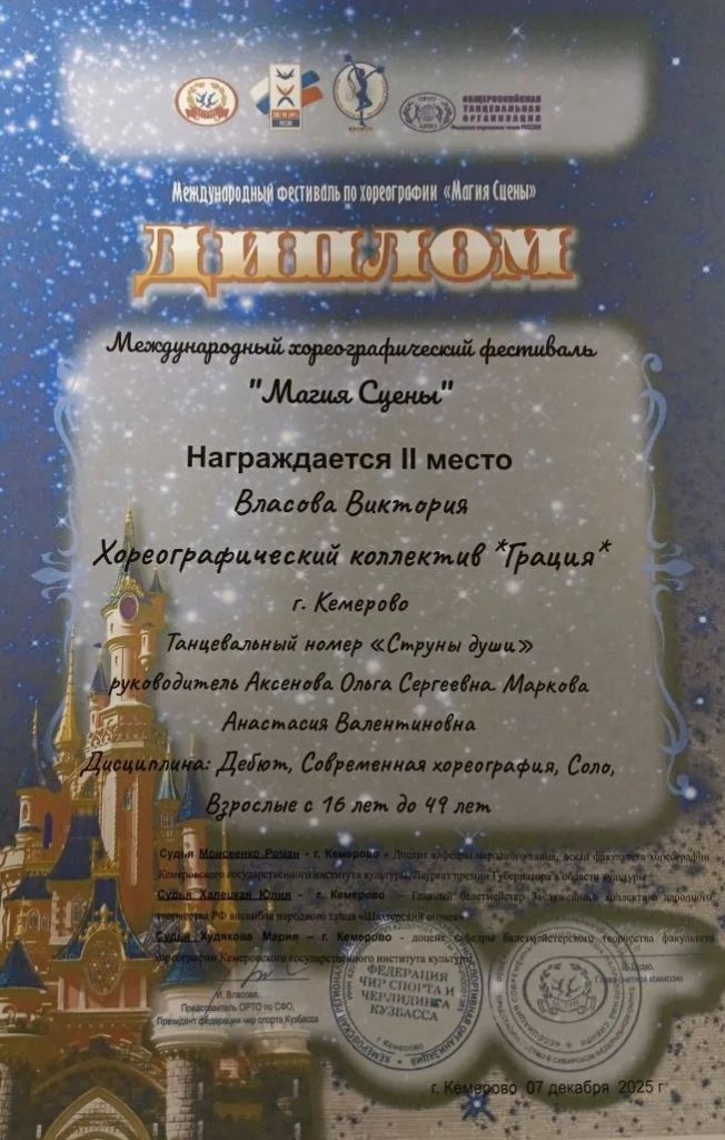 7 декабря 2025 года солистка хореографического коллектива «Грация» Дворца творчества детей и молодёжи Ленинского района Власова Виктория под руководством Аксёновой О.С., Марковой А.В. приняла участие в международном хореографическом фестивале «Магия сцены» с танцевальным номером «Струны души».