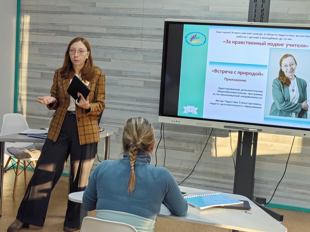 В 2024 году Радостева Елена Сергеевна стала победителем регионального этапа ХІХ ежегодного Всероссийского конкурса в области педагогики, воспитания и работы с детьми и молодежью до 20 лет «За нравственный подвиг учителя» в номинации «Лучшая дополнительная общеразвивающая программа духовно-нравственного и гражданско-патриотического воспитания детей и молодежи». На консультации Елена Сергеевна поделилась с коллегами своим опытом участия в конкурсе и рассказала о своей конкурсной работе, адаптированной дополнительной общеобразовательной программе естественнонаучной направленности «Встреча с природой».